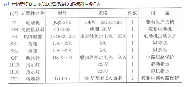 图3所示为带指示灯的电动机连续运行控制电路原理图。图中所用的元器件见表1。